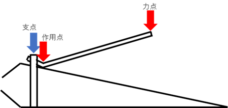 てこの原理は小学校でも習ったように、支点・力点・作用点の三つの力でなされる原理のことです。てこの原理は支点と作用点の距離が近ければ近いほど、あるいは支点と力点の距離が遠ければ遠いほど、小さい力で大きな力を生み出すことができます。