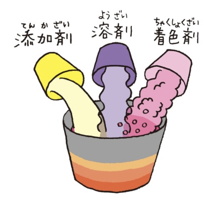 インクの原料となる着色剤(ちゃくしょくざい)、 溶剤(ようざい)、添加剤(てんかざい)を、 配合釜(はいごうがま)の中に入れてよくまぜあわせる。