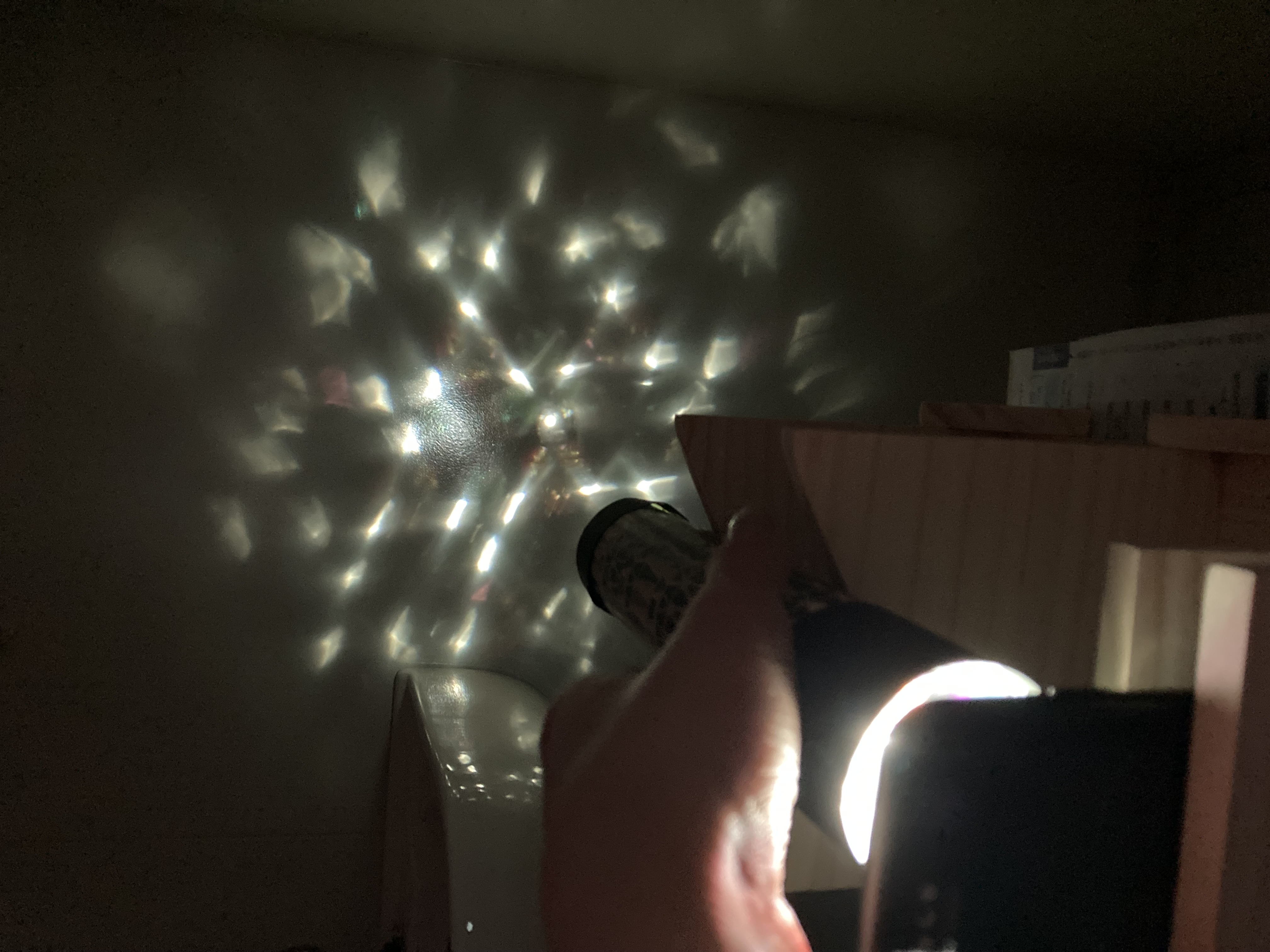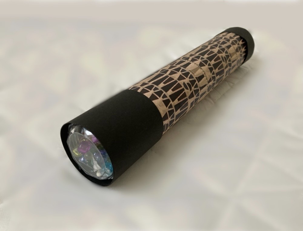 観察者は筒の一端からのぞき込み、他端からは光が入り鏡で反射する。 鏡を45度の角度に交差させると8個、60度では6個、90度では4個の1回の反射による鏡像が見られる。 筒を回転すると着色された物体が移動し、さまざまな色や模様を見ることができる。鏡の対称性により美しい図形が見られる。 2枚の鏡でできたものは背景から独立したパターンとなるが、閉じた三角形の鏡でできたものは視界の全体がパターンとなる。